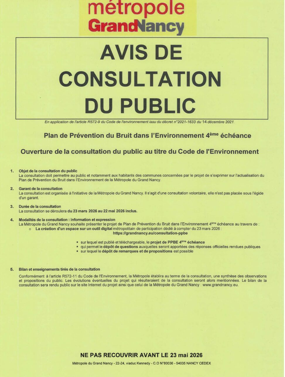 Consultation initiée par la Métropole du Grand Nancy; d’une durée de 2 mois : du 23 mars au 22 mai 2026.