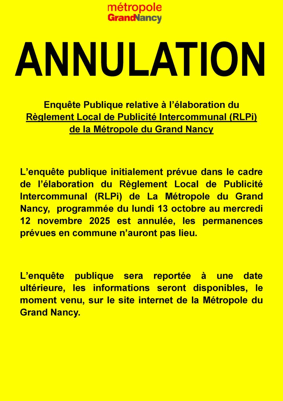 L’enquête publique initialement prévue dans le cadre de l’élaboration du Règlement Local de Publicité Intercommunal (RLPi) de La Métropole du Grand Nancy, programmée du lundi 13 octobre au mercredi 12 novembre 2025 est annulée, les permanences prévues en commune n’auront pas lieu.