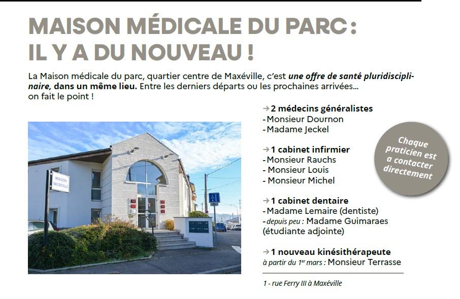 Suite à la parution du Journal de Maxéville n°70, une mise à jour des noms du cabinet infirmer de la Maison Médicale du parc quartier est publiée :