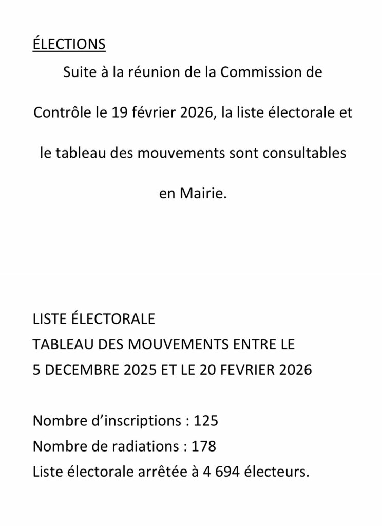 Dans chaque commune il existe une commission de contrôle des listes électorales dont les membres sont désignés par arrêté préfectoral. Celle commission, qui se réunit au moins une fois par et obligatoirement avant tout scrutin, a comme mission de :
