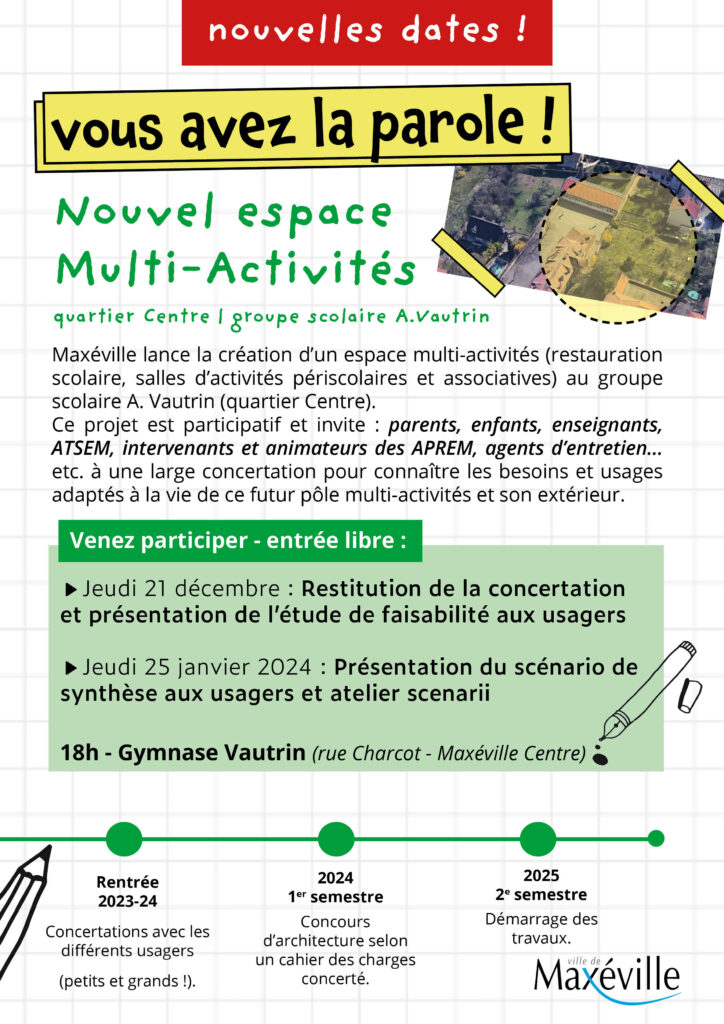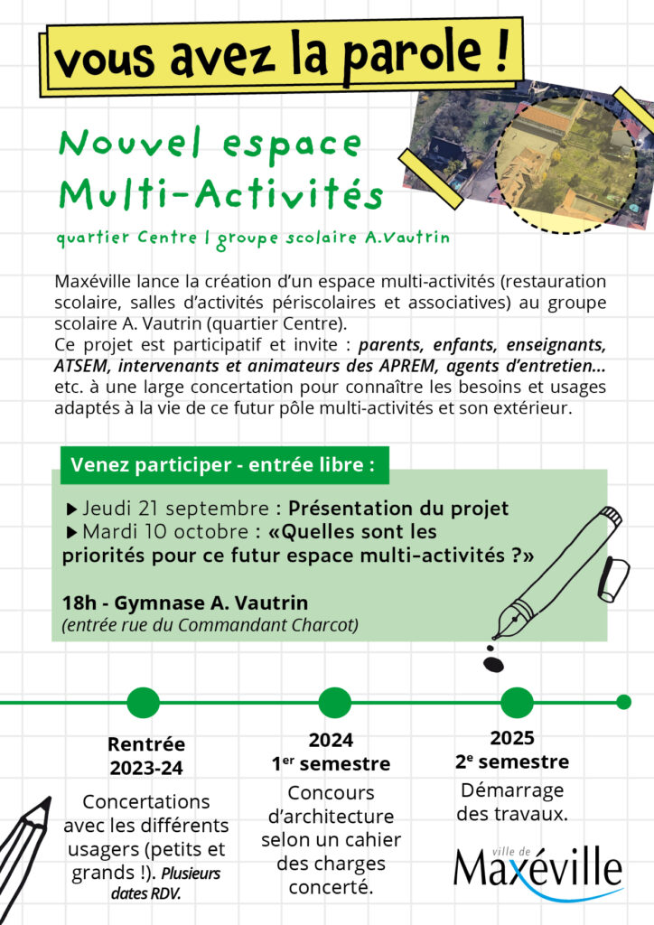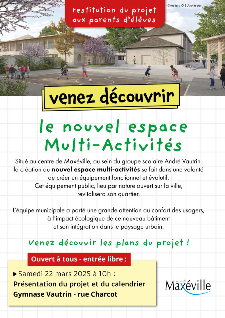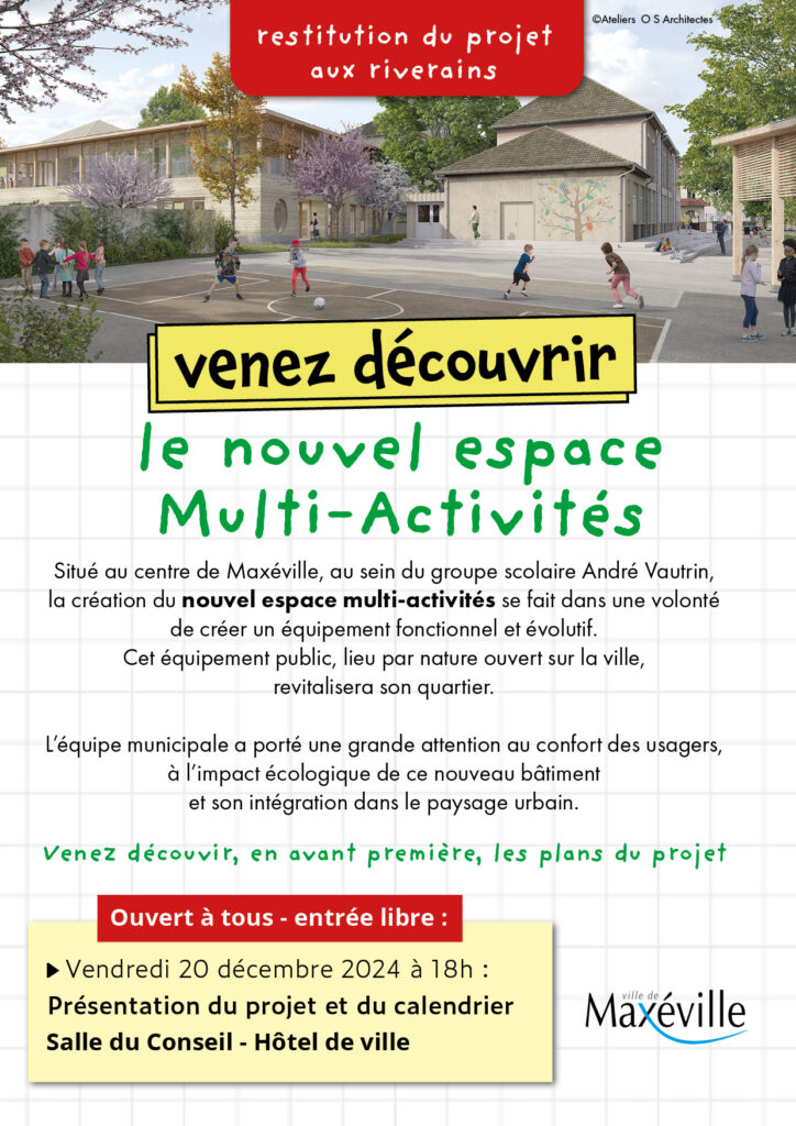 Depuis 2022, la ville de Maxéville entreprend la création d’un espace multi-activités quartier centre, entre l’école maternelle et l’école élémentaire André Vautrin.